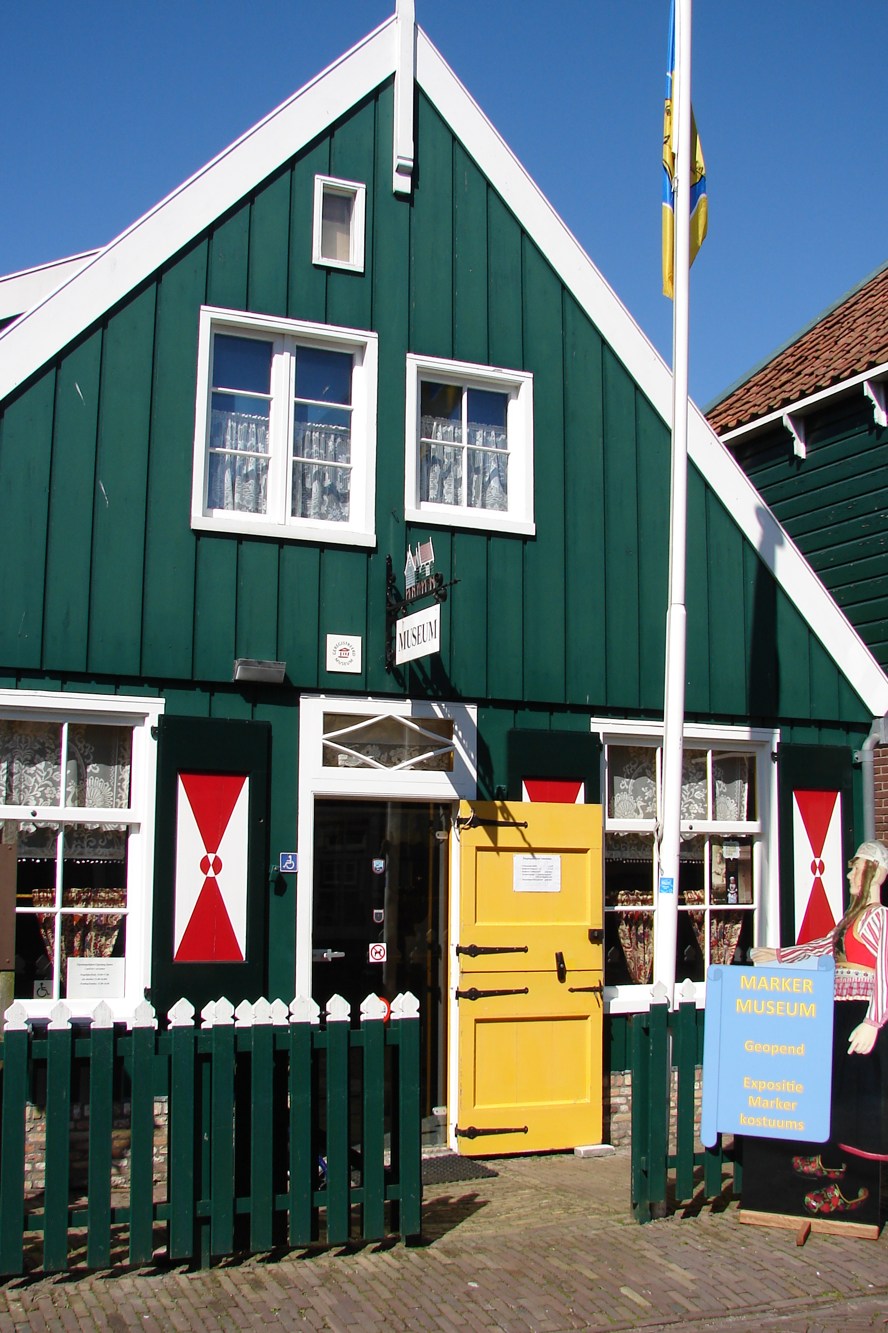 Foarte aproape de Volendam , separate de mare , ajungem la Marken. Aflat la 20 de km depărtare de Amsterdam , a fost un sat de pescari pe o insulă din lacul interior , Isselmeer , la 2,5 kilometrii de coastă ; din 1957 a fost unită printr-un dig peste care trece șoseaua , considerându-se azi peninsulă . În secolul al XII-lea , călugării de Frisa s-au așezat aici , iar principalele surse de viață era pescuitul , agricultura și creșterea animalelor . Cu scopul de a se proteja de furia apelor au construit diguri , iar casele sunt așezate în zonele mai înalte . În ziua de azi este un important punct de atracție turistică , vechea ocupație , pescuitul , făcând parte din trecut .