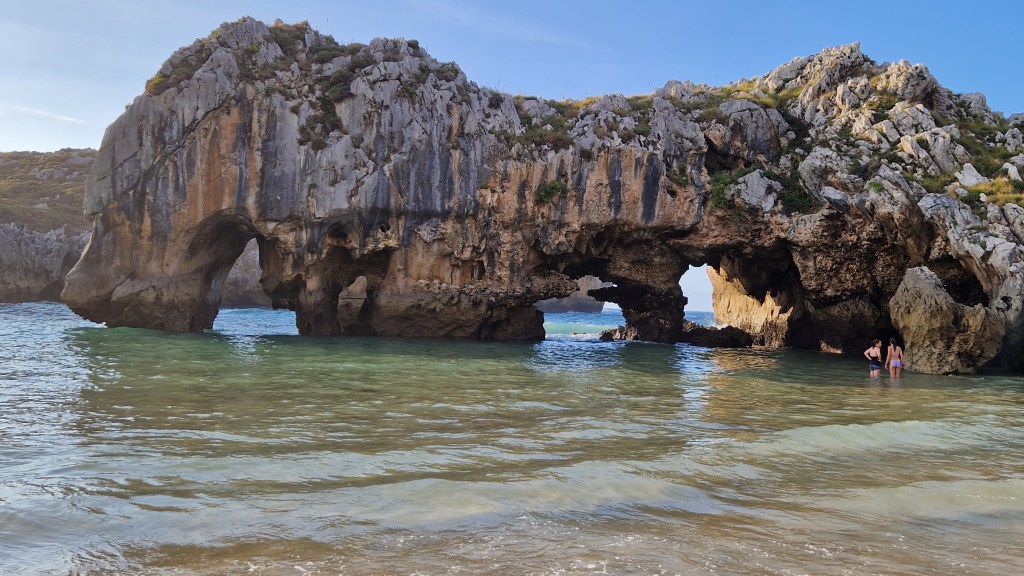 Plaja Cuevas del Mar , se află în apropiere de Ovio , nu departe de Ribadesella , iar numele ei descrie forma plajei ce are multe peșteri . O plajă spectaculoasă cu peisaje superbe mai ales la apusul soarelui . De la capătul plajei o potecă te duce sus pe munte , la o bisericuță veche , Ermita de San Anton . Peisajele de aici sunt spectaculoase iar printre stânci am găsit un „bufon „al cărui zgomot l- am auzit din depărtare .